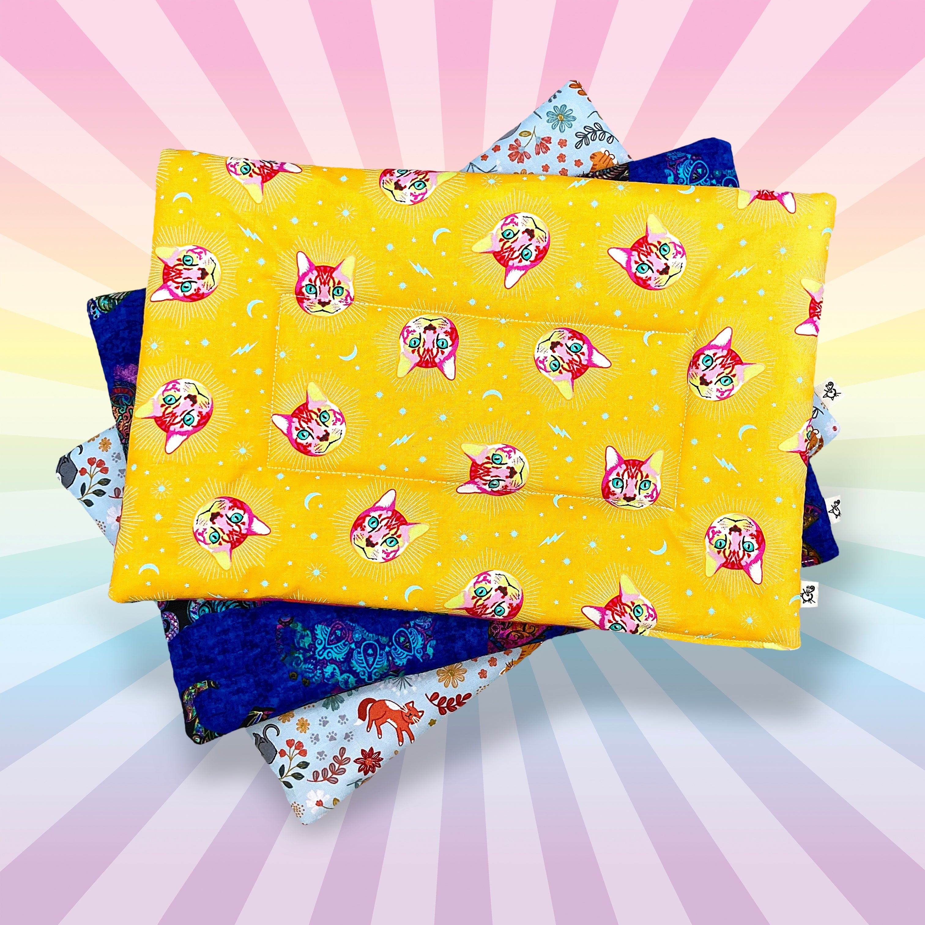 Just lay it down anywhere and watch your cats go crazy on it. They will roll, play, chew, lick and kick it around. Be assured they will get all the exercising they need with this yoga mat. Each mat comes with a half cup of catnip in it! One side of the mat has a cat print while the other side has a coordinating fabric.